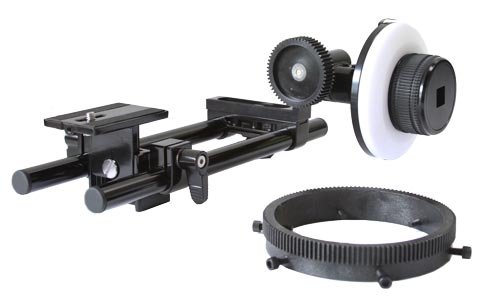 Kits Includes: Pro Geared Follow Focus, White Marking Disk, Universal Lens Gear, Tripod Baseplate, Two 9" in Rods