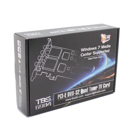 TBS6984 PCI-E DVB-S2 Quad Tuner TV card is designed to fulfill the needs of watching/recording multiple satellite TV channels on PC simultaneously. With Single tuner TV card, you're limited to watch or record one satellite TV channel at one time only. While with this quad tuner TV card, you can watch one channel and record three other channels at the same time. Even more if you want to make full use of the recording power of TBS6984, you may record four whole TS(Transponder Stream),one of which could contains maximum ten, twelve SD or HD TV channels into your PC hard disk. TBS6984 contributes a lot especially when you are building up HTPC or IPTV streaming server.(There are thousands of TBS6984 cards running in different IPTV servers on 24/7 none stop working base worldwide) You can use it to watch any FAT satellite TV programs in your region.. By using appropriate software, e.g. MediaPortal and its' plugins, you may stream satellite TV contents to your IPhone, IPAD or IPOD. Specifications: Receiving Frequency: 925~2175 MHz Tuning Range Input Level: -69~23dBm 4x Advanced DVB-S2/DVB-S 8PSK QPSK Demodulator Symbol Rates: DVB-S QPSK: 1-45 Msps DVB-S2 8PSK/QPSK: 2-36 Msps Code Rates: DVB-S: 1/2, 2/3, 3/4, 5/6, 7/8 DVB-S2 QPSK: 1/2, 3/5, 2/3, 3/4. 4/5. 5/6, 8/9, 9/10 DVB-S2 8PSK: 3/5, 2/3. 3/4. 5/6. 8/9, 9/10 Automatic Acquisition Range: ±10MHz DiSEqC 2.x Compliant System Requirements: Windows 2000/XP/Vista/7 or Linux DirectX9.0 or later Version Available PCI Express x1,x4, x8 or x16 slot Satellite Dish and LNB